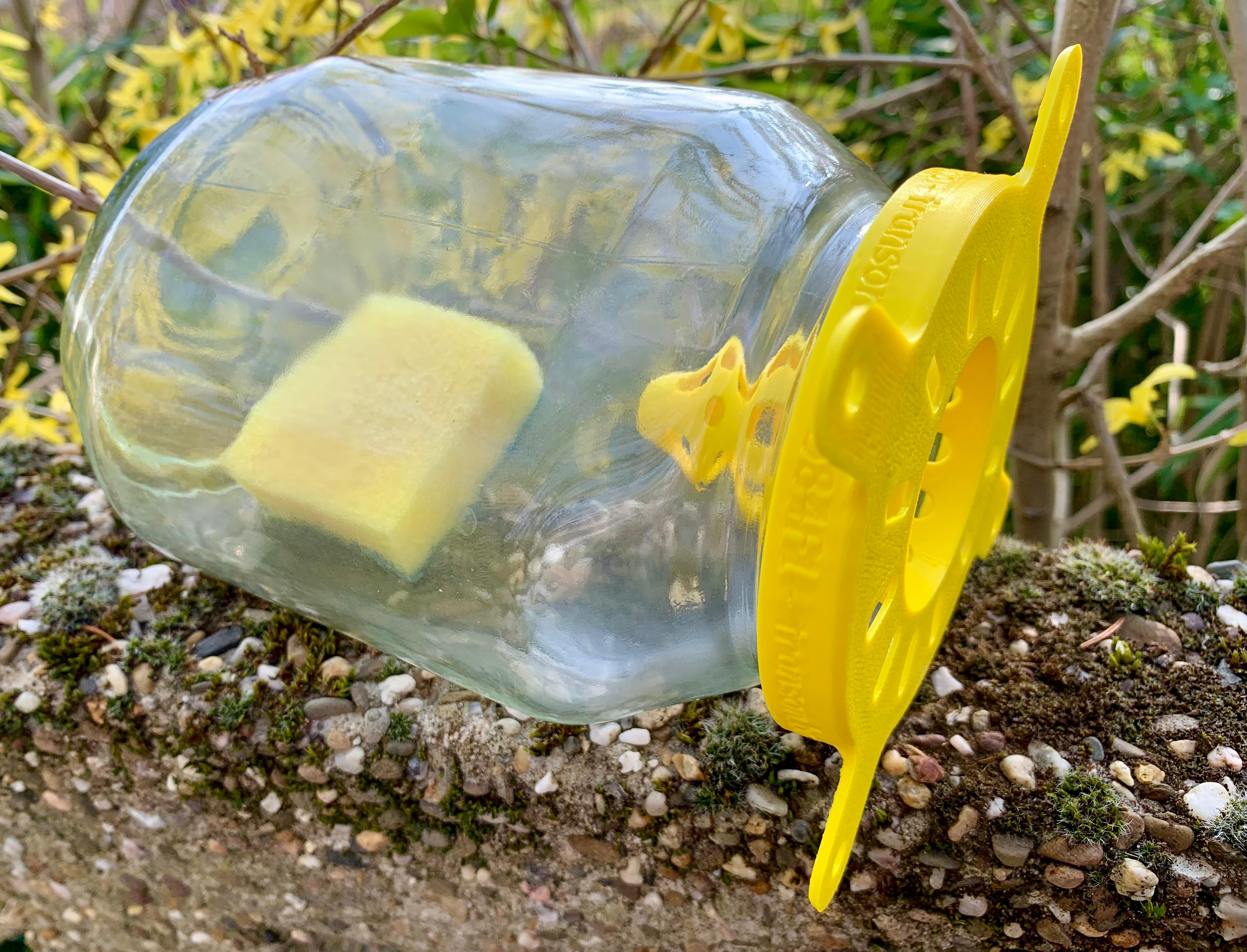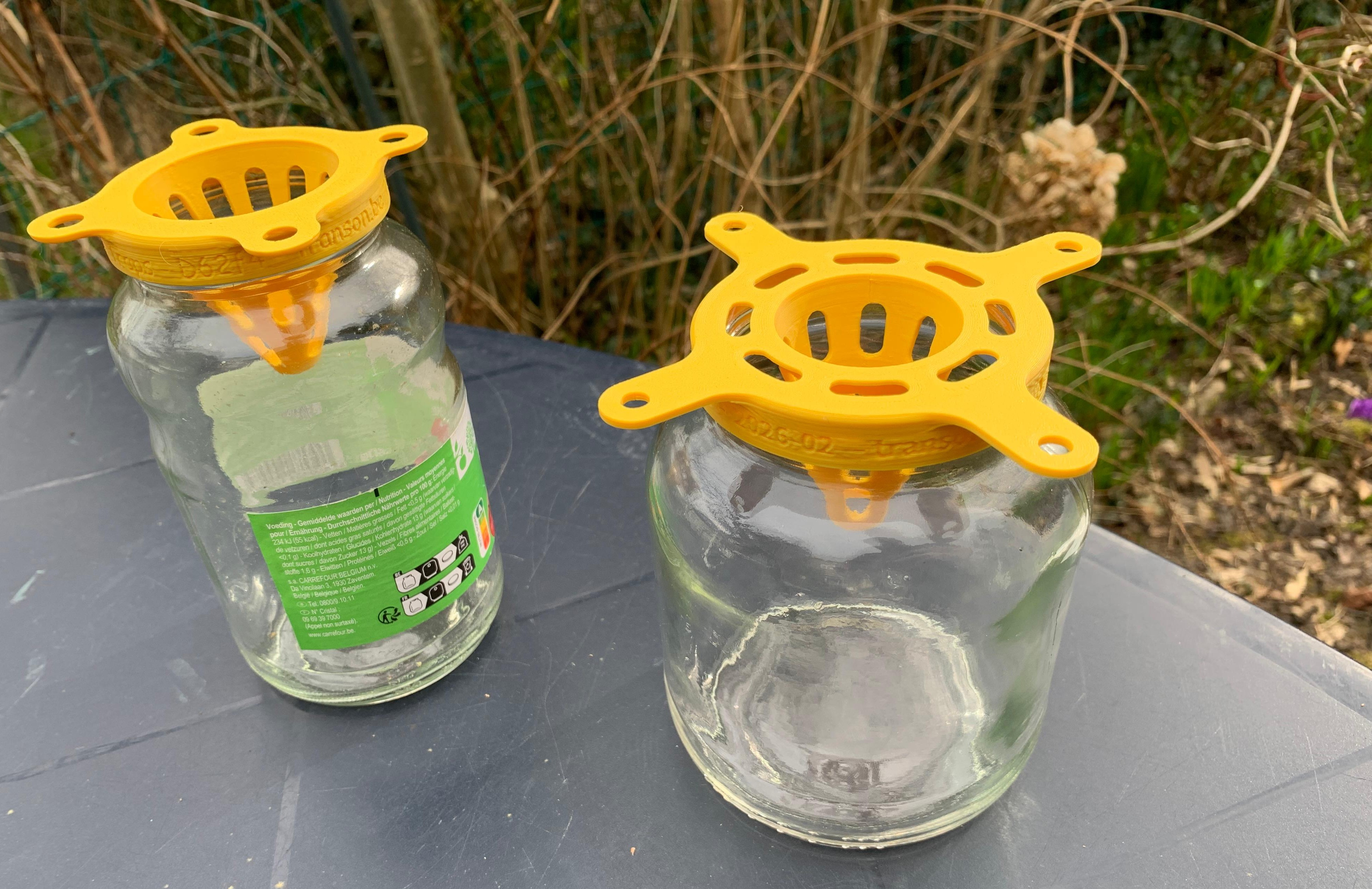 Chaque piège est imprimé en 3D et disponible en plusieurs diamètres afin de s’adapter parfaitement au bocal que vous possédez déjà (pots de confiture, compote, cornichons ou tout autre bocal de récupération). Il suffit de choisir le diamètre correspondant à l’ouverture du bocal, de sélectionner le nombre de filets, d’ajouter l’appât, puis de visser le piège : le dispositif est prêt à l’emploi.